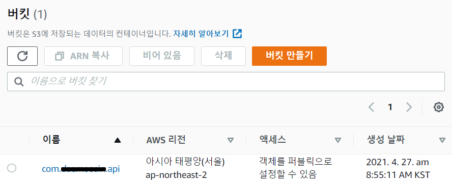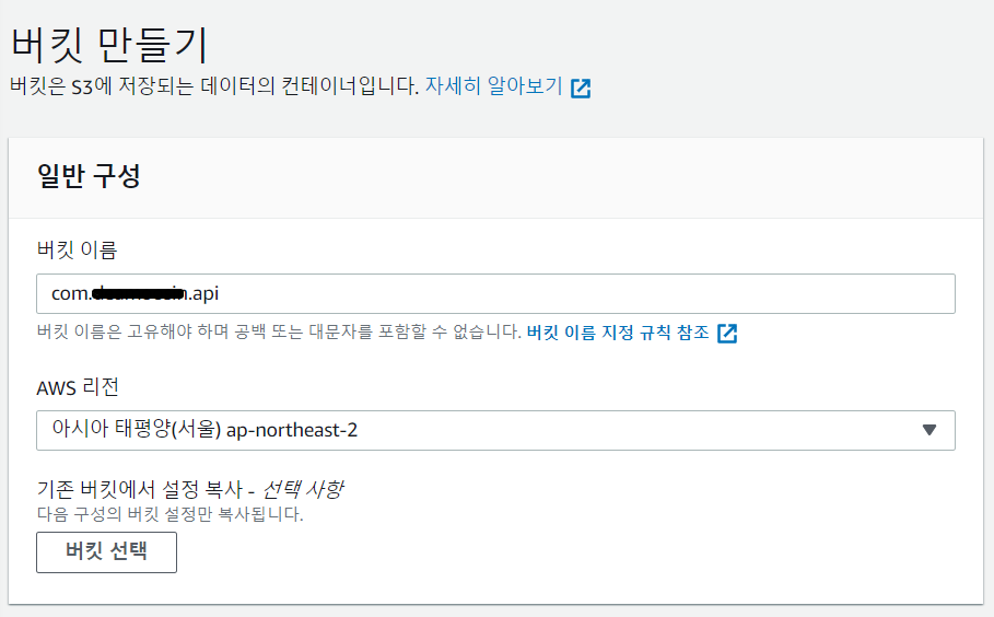- 버킷을 생성한다. 구성은 개발할 때 패키지 형식인 com.sample.api 방식으로 한다. 버킷이름은 S3 내부에서 유니크 해야 하므로 같은 팀일지라도 다른 이름을 사용해야한다. 예를들면 web.team.com, app.team.com, service.team.com 이런식으로 권장한다. 즉 세계에서 유니크해야한다.