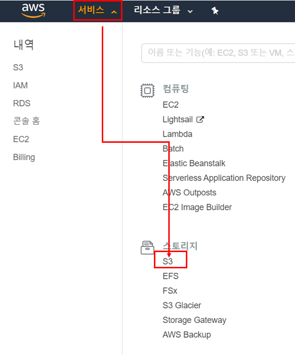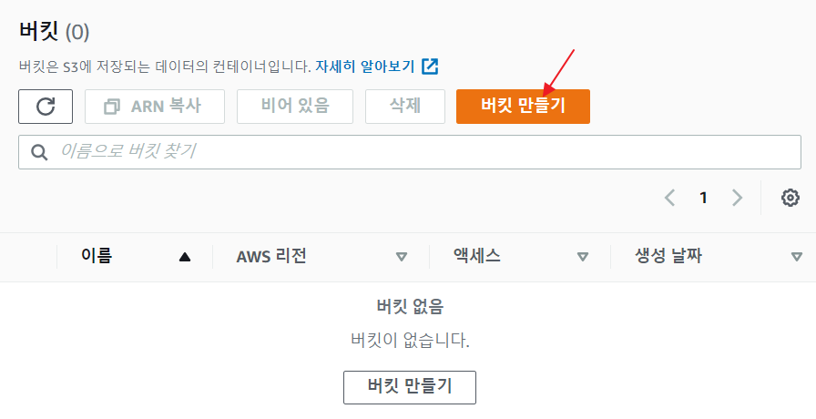 - 서비스에서 S3를 검색한 후 들어온다.