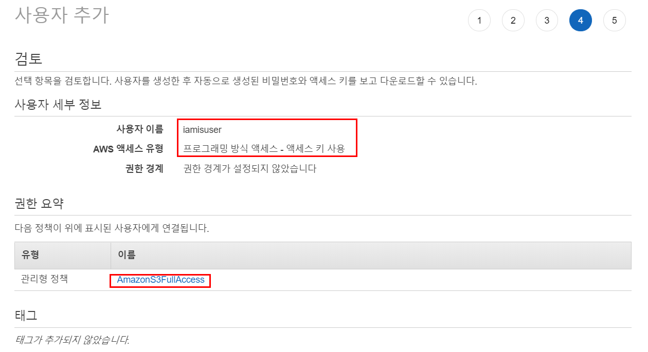 - 사용자 추가 후 IAM 에 다시 들어간다. 만약 IAM 단계에서 잘못된 경우 버킷정책을 수정하려고 하면 Amazon S3 콘솔에서 "액세스 거부" 오류가 발생할 수 있다.