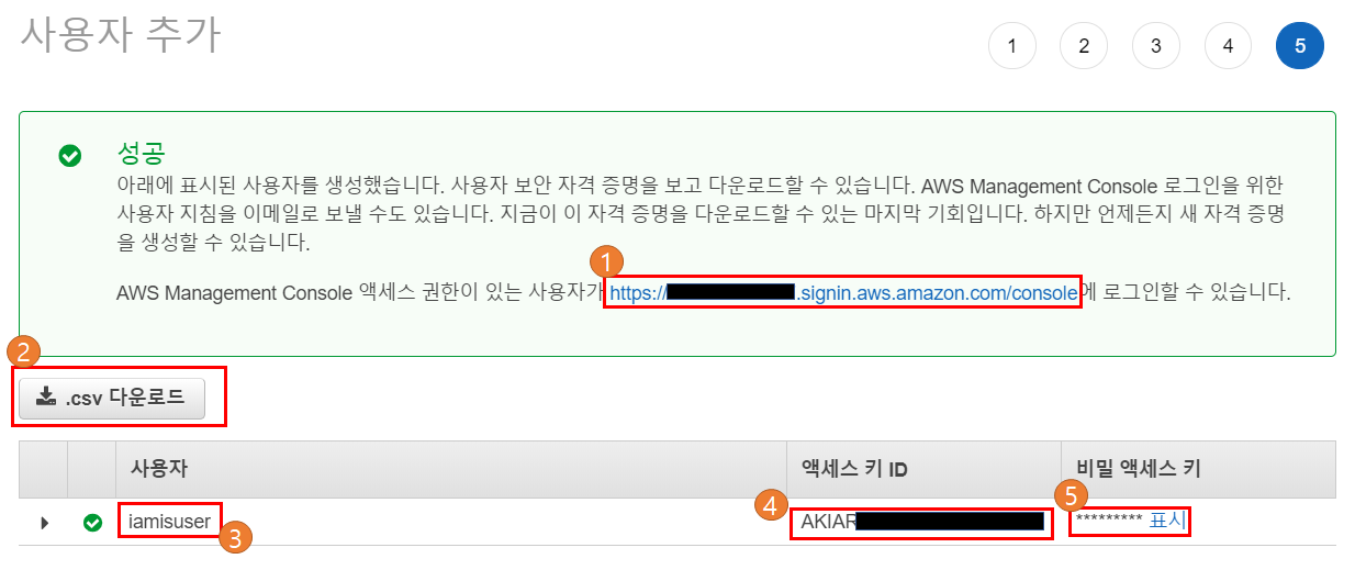 - CSV 파일 로컬에 저장한다. URL, 사용자 정보, 액세스키, 비밀엑세스키 표시 클릭 후 별도로 기록해 둔다.