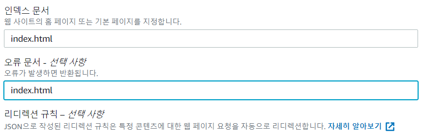 - 인덱스 문서에는 index.html 을 입력한다. 이때 상단에 보이는 엔드포인트가 도메인으로 연결된다. 따로 메모장에 기록해 둔다.