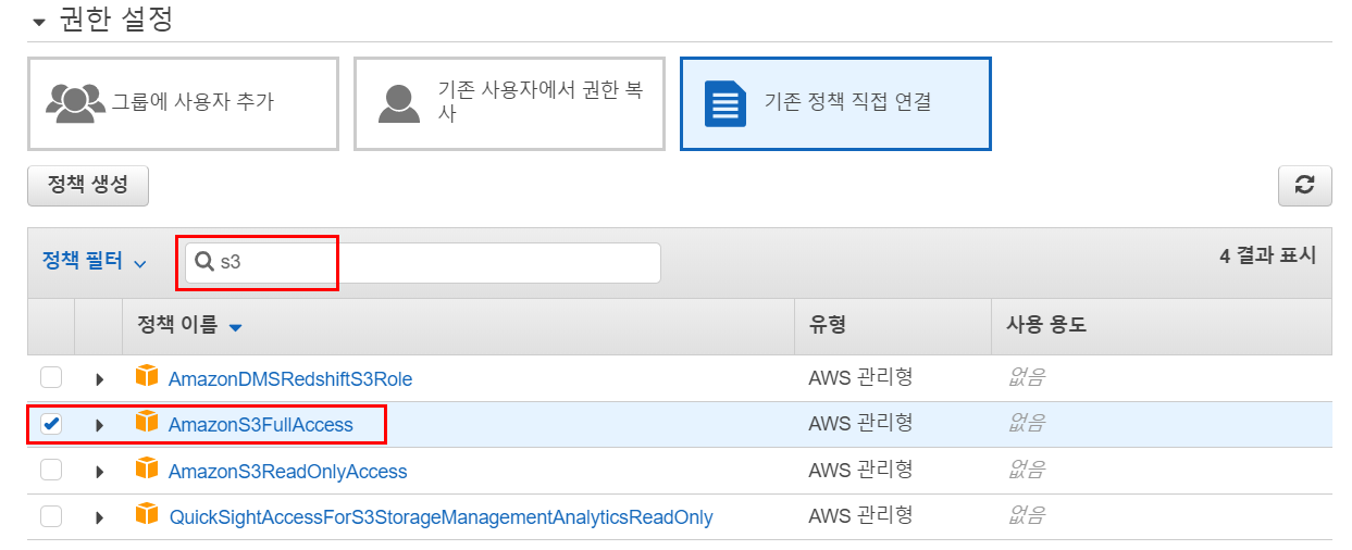 - 정책필터 검색창에 S3 입력 후 기존 정책 직접 연결 탭을 선택한다. 옵션은 AmazonS3FullAccess 를 체크한다.