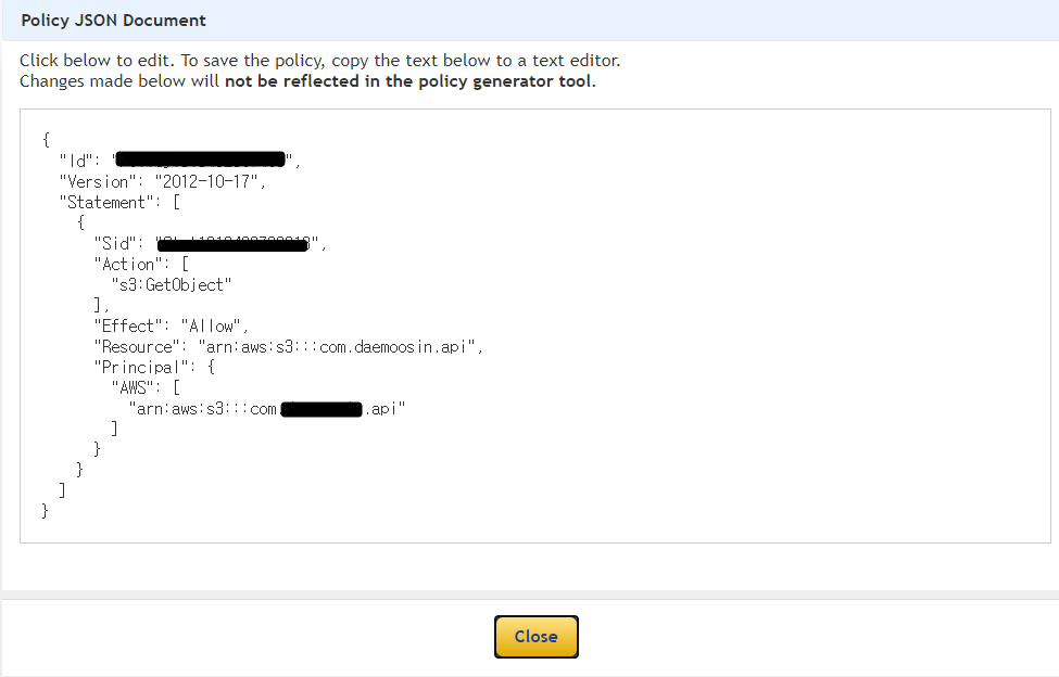 - 6. 다시 권한 탭을 클릭하면 방금 입력한 값이 들어와 있고, 버킷정책이 퍼블릭으로 태깅되어 있는 것을 확인할 수 있다.